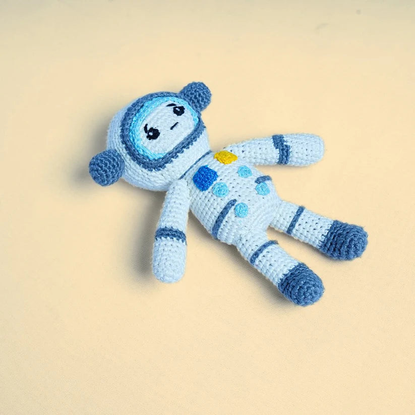 Blast off into imagination with this adorable crochet astronaut stuff toy, intricately made using the amigurumi technique. Each piece is handcrafted with care, giving it a unique character that’s perfect for both playtime and décor. Detailed with a charming helmet, expressive eyes, and stitched suit accents, this plush toy is a delightful companion for storytime, space-themed nurseries, or collector displays. Sized perfectly for tiny hands to grasp, hold, and carry making it an ideal travel buddy or bedtime friend.