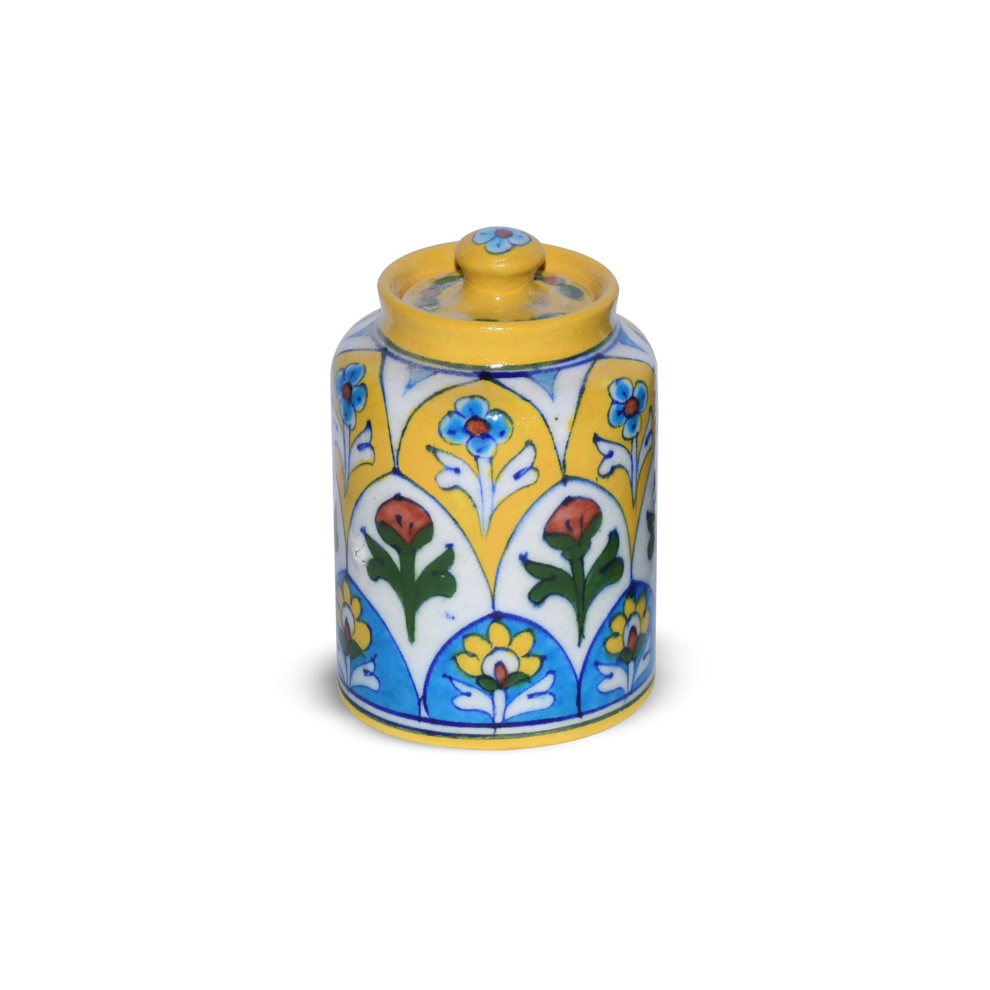 Add a splash of traditional charm to your home with this exquisite Decorative Storage Jar, handcrafted in the world-famous Jaipur Blue Pottery style. Each piece is meticulously made by skilled artisans of Rajasthan using age-old techniques that combine natural colors, hand-painted floral motifs, and glazed ceramic finish.