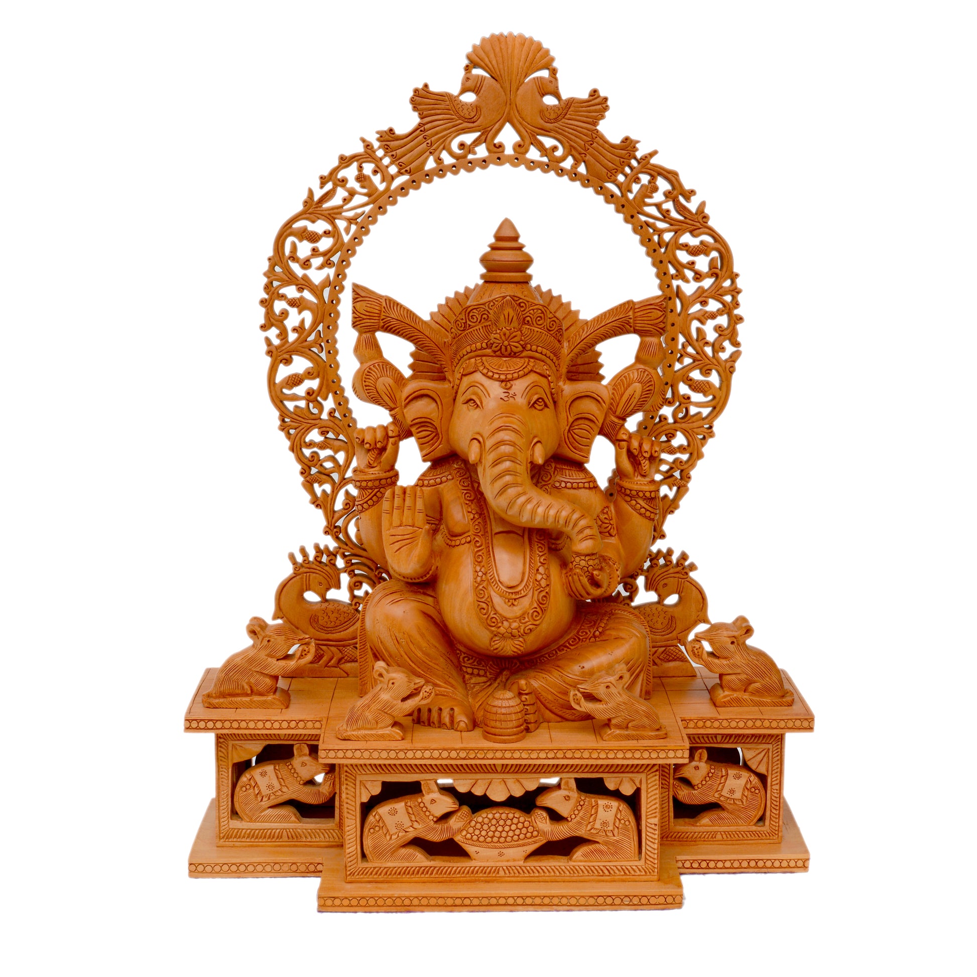 Bring home divine grace and artistic elegance with this Handcrafted Wooden Lord Ganesha Statue, meticulously carved by skilled Indian artisans. This stunning wooden decorative piece depicts Lord Ganesha, the remover of obstacles and symbol of wisdom, seated majestically under an intricately carved Mehrab (arch) with detailed motifs of peacocks and floral patterns.