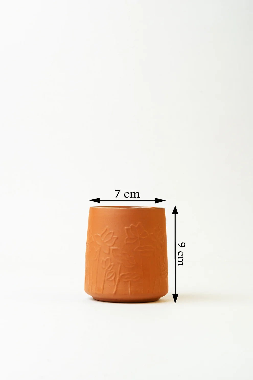 Bring a touch of nature to your table with the Lotus Motif Terracotta Glass. Its sleek, modern shape beautifully complements the rustic charm of its natural terracotta construction. Perfect for serving water, juice, or other chilled drinks, this 300ml glass is a stylish and earthy addition to any drinkware collection.